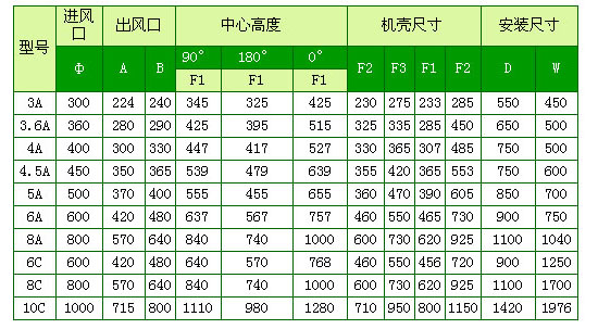 A式為葉輪和電機(jī)直聯(lián),C式二種,900轉(zhuǎn)-1250轉(zhuǎn)為軸座傳動(dòng),1250轉(zhuǎn)-1600轉(zhuǎn)為軸承箱傳動(dòng)